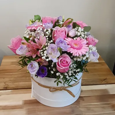 See rikkalik lillekarp roosade roosidega on loodud neile, kes armastavad naiselikku ja romantilist stiili. Seade on tihe ja ümar, peites endas tõelist lillede küllust. Karbi südameks on lummavad roosad roosid eri varjundites, mida täiendab üks silmapaistev ja rõõmus gérbera.