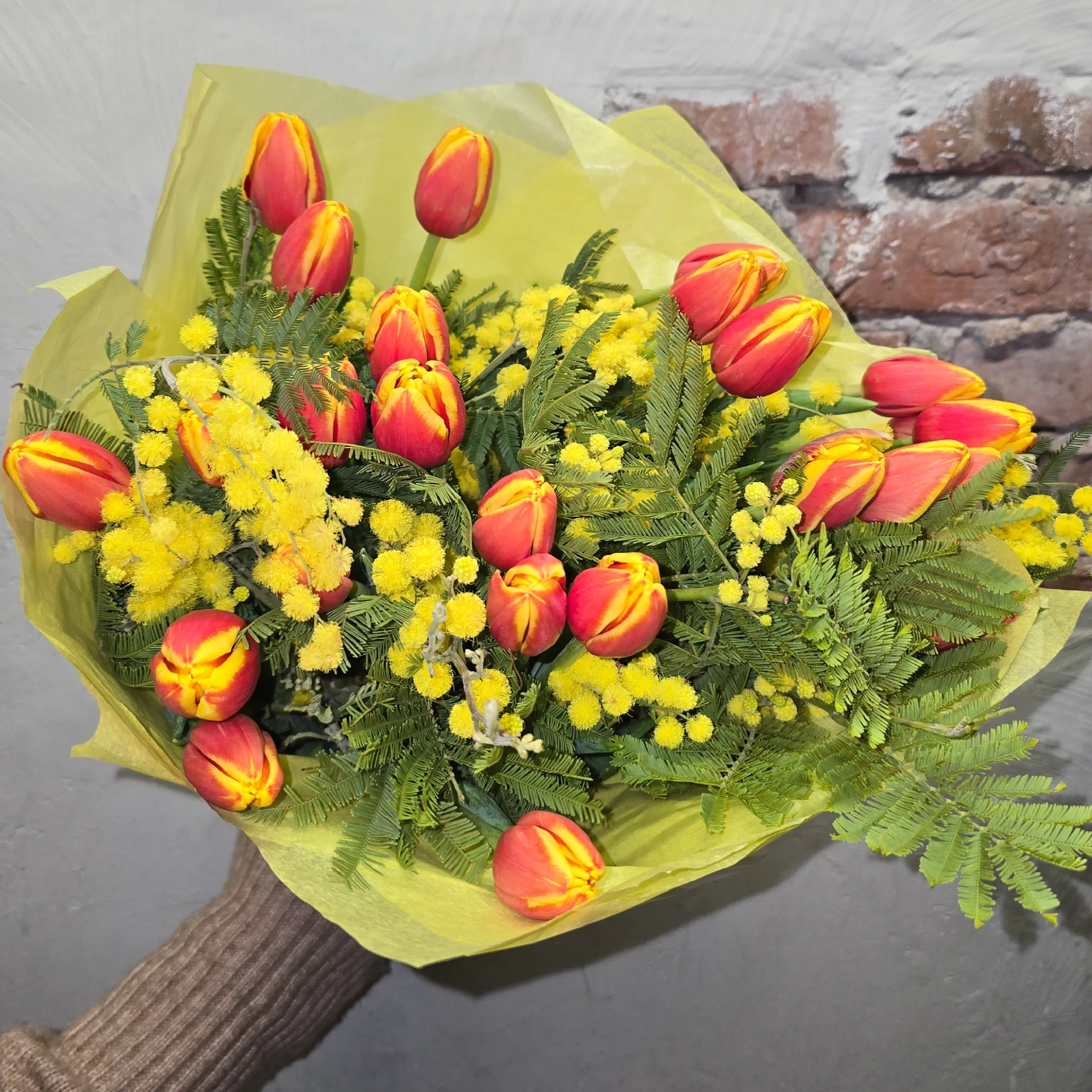 Päikeseline kimp kevadisi kollaseid mimoose ja kollase-punaseid tulpe loob rõõmsa ja elegantse kontrasti, tuues soojust ja värvi igasse ruumi.