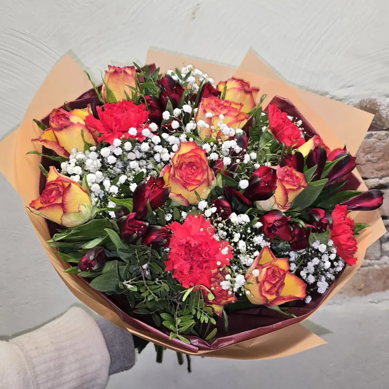 See kimp on tõeline sügisene meistriteos, mis ühendab endas soojust ja elegantsi. Kollased ja oranžid roosid, nagu leegid, tõmbavad endasse kogu tähelepanu, samas kui punased nelgid lisavad kompositsioonile sügavust ja kirge. Valge kipslill loob õhulise ja kerge tausta, mis rõhutab lillede ilu. See kimp on ideaalne valik, et tuua sügisene päike ja rõõm igasse koju.