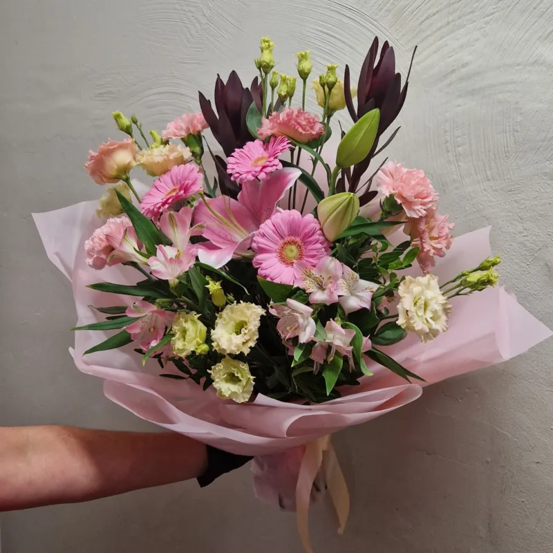 Õrnad roosad gerberad, kreemikad nelgid, lillad alströmeeriad ja roheline lisianthus loovad romantilise kimbu.