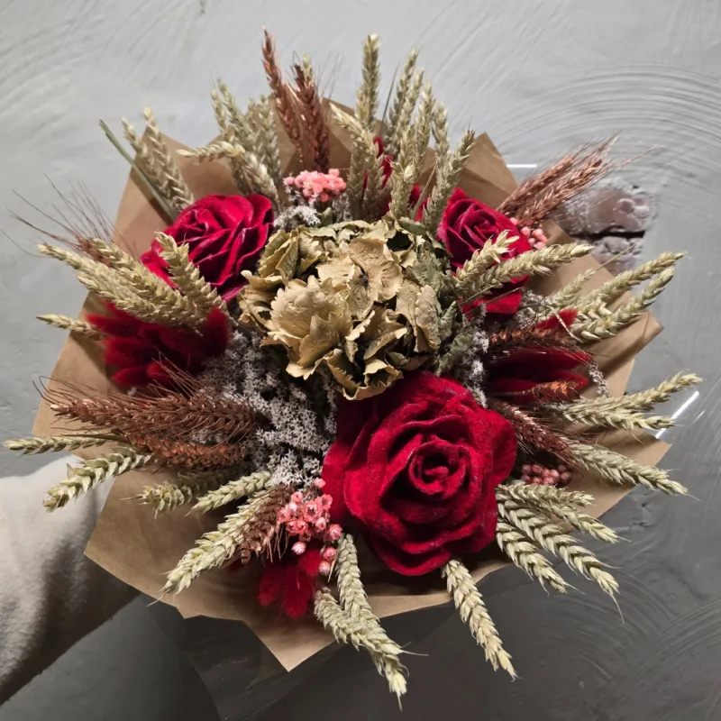 Eksklusiivne kuivlillekimp kolme vahast roosiga. Ideaalis interjööri kaunistuseks või kingituseks. Säilitab ilu aastaid.