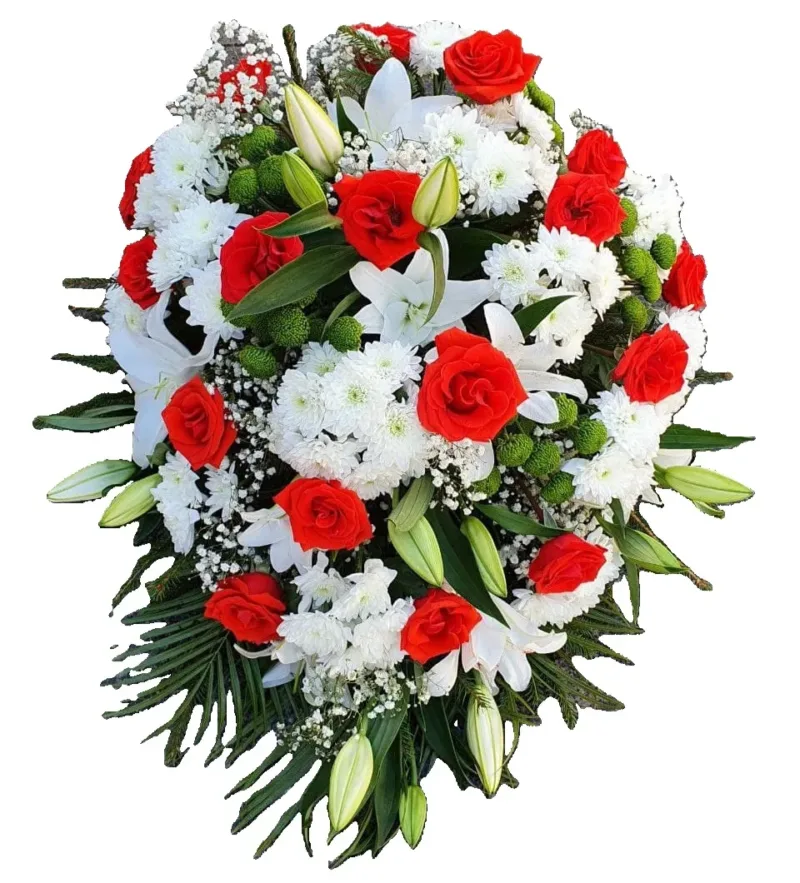 Märkimisväärne leinapärg valgete liiliate, krüsanteemide ja erksate punaste roosidega. Kaunis viis avaldada sügavat kaastunnet ja mälestust.