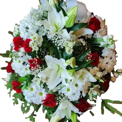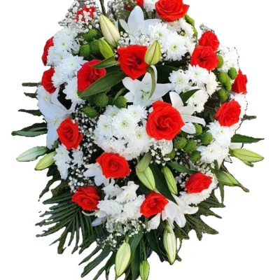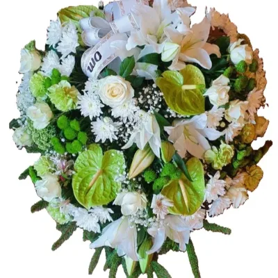 See traditsiooniline ümmargune mälestuspärg valgete roosidega on loodud sümboliseerimaks igavest mälestust ja sügavat lugupidamist. Seade rahustav värvigamma ja klassikaline vorm pakuvad lohutust ning väljendavad kalleid mälestusi kõige kaunimal viisil.