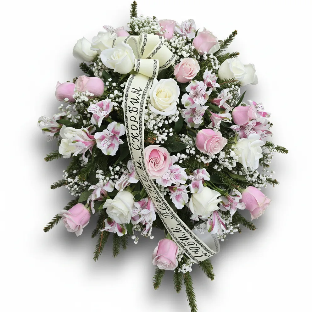 Pärja südameks on puhtust sümboliseerivad valged roosid ja õrnad roosad õied, mis on põimitud graatsiliste alstromeeriatega. Igihaljad okaspuuoksad loovad tugeva ja väärika aluse, samas kui õhuline kipsilill lisab seadele vajalikku pehmust. See mälestuspärg valgete roosidega on valmistatud suure hoolega, et saata viimne tervitus siiralt ja südamlikult.