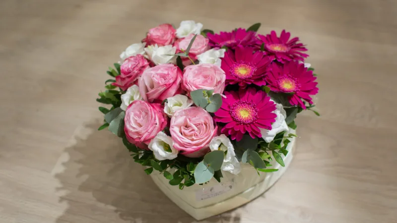 Õrnad roosad roosid, valged lilled ja erksad gerberad südames – liigutav armastuseavaldus.